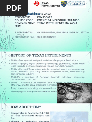 Thanks to its products, texas instruments has revolutionized the entire educational technology. We are a global semiconductor company that designs, manufactures, tests and sells analog and embedded processing chips. Company profile page for texas instruments malaysia sdn bhd including stock price, company news, press releases, executives, board members, and contact information. Growing from strength to strength, it always. We are one of the largest volume manufacturing sites for semiconductor assembly and test.