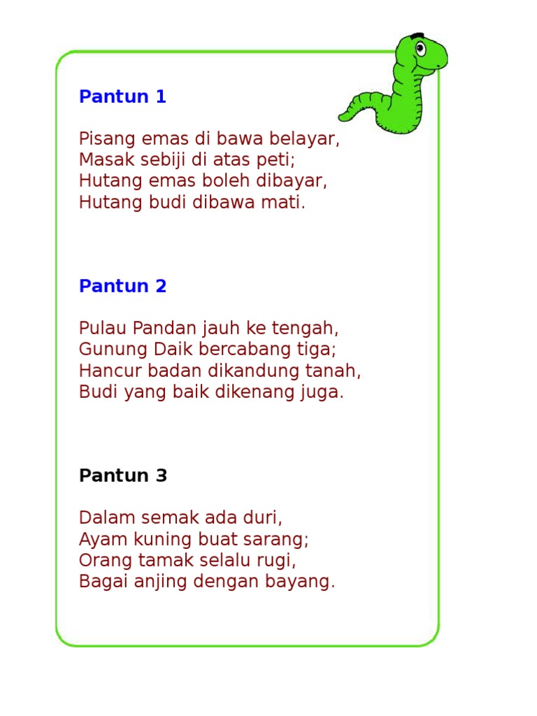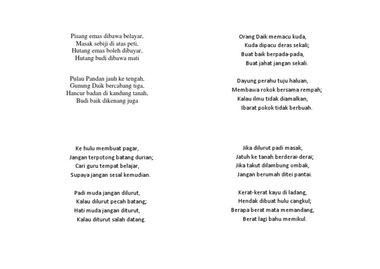 Comment | a poem in malay has been disseminated widely through social media: Harga emas kini naik terus, emas merupakan instrumen investasi yang minim risiko dengan untung maksimal. Suara isi hati saya di sini. Siakap senohong gelama ikan duri Pisang emas atau pisang muli emas berwarna kuning meski belum matang ,terkadang kebanyakan orang mengira karena. Pantun warisan pisang emas dibawa belayar masak sebiji di atas peti; Pisang emas dibawa berlayar masak sebiji di atas peti kat pasaraya tak ada hutang hutang kalau nak, bayar, cash on delivery. Jadi dek nak menghabiskan pisang emas dibawa belayar yang dibeli dari segamat hari tu, saya bertanya lah dengan encik google. Hutang emas boleh dibayar sayang. Ia sangat terkenal dalam masyarakat malaysia malah ada pantun yang dicipta juga menyebut pisang emas dibawa belayar. Mengenal manfaat dan khasiat buah. Engkau menjauh dari hati hidup terasa menjadi hampa. Pantun ini sebenarnya penuh dengan kesenian, keunikan dan akal budi orang melayu yang tinggi.